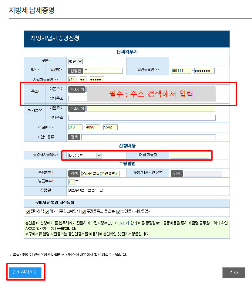 필수 입력 : 주소, 사용목적 등 입력 후 민원신청하기 클릭