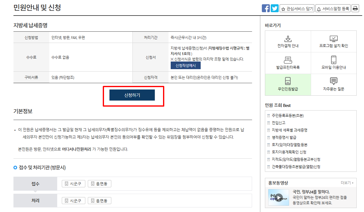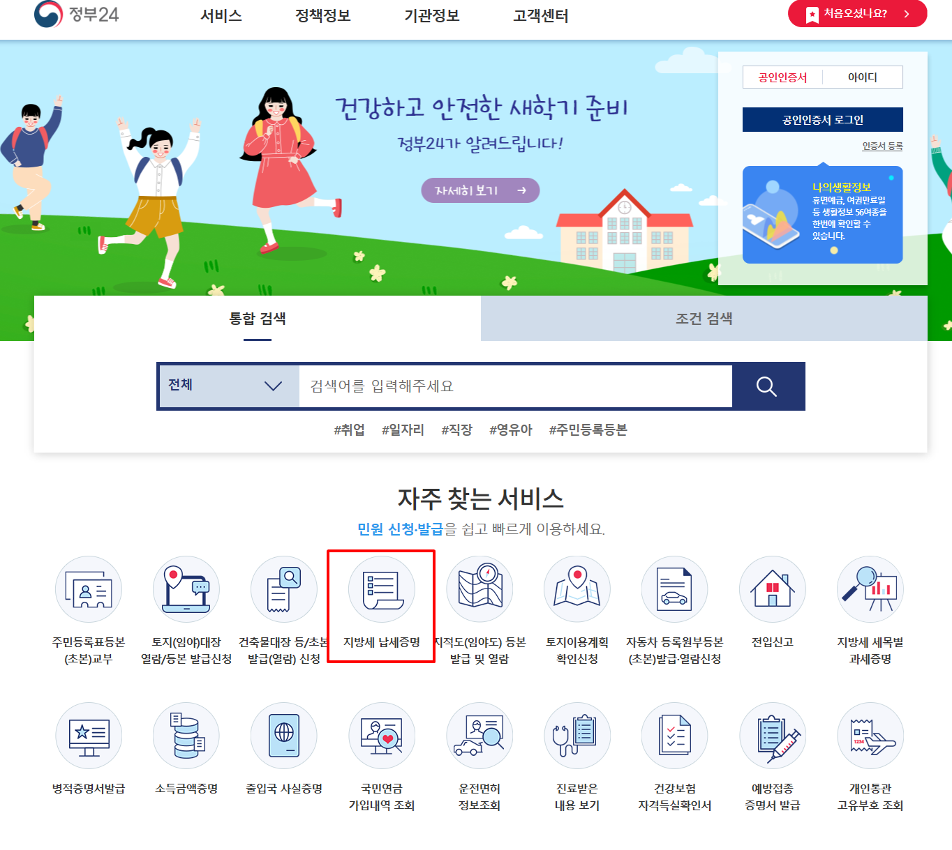 통합검색에 "지방세 납세 증명" 이라고 처도 되겠지만 자주 찾는 서비스에 친절하게 버튼이 있다.
