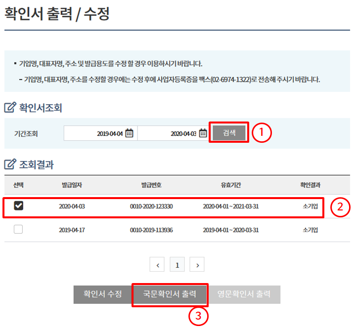 조회결과가 나옵니다. 해당하는 확인서룰 [선택]하고