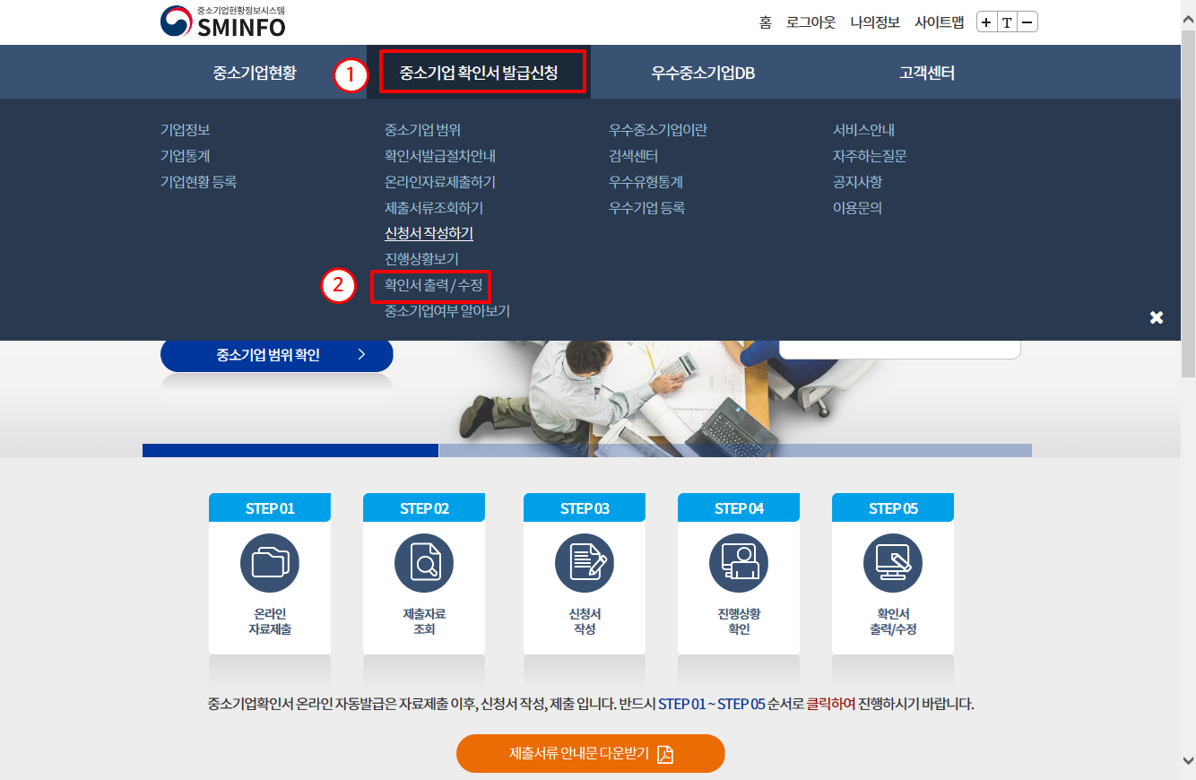 1. 메인화면에서 [중소기업 확인서 발급신청] 메뉴에서 [확인서 출력/수정] 화면으로 이동합니다.