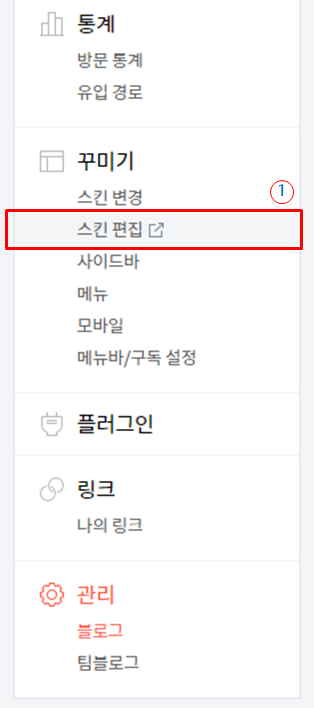 관리자 페이지에서 좌측 메뉴에서 꾸미기 > 스킨편집을 선택합니다.