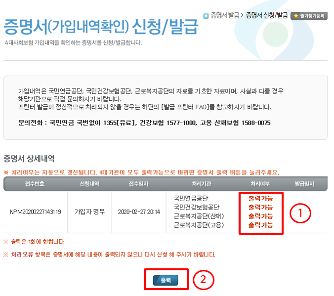 이 4가지 기관이 "출력가능"으로 바뀌면 아래 [출력] 버튼을 누르면 출력이 가능합니다.