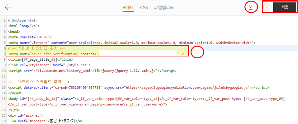 ① 소스 코드를 HTML 편집창에서 상단에 다른 meta 태그에 넣어주시면 됩니다.