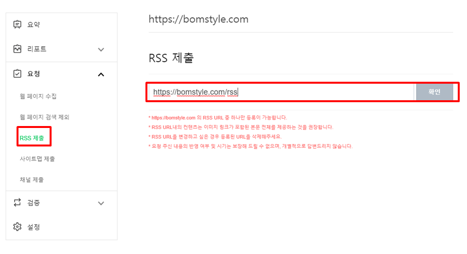 [요청]에서 [RSS 제출] 메뉴를 선택하면 RSS 제출 화면이 나옵니다.