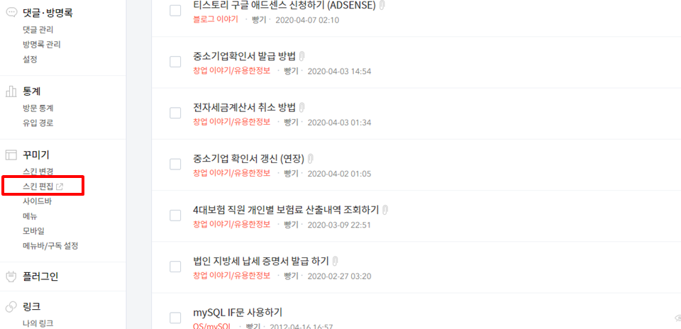 5. 티스토리 관리자 화면에서 꾸미기 메뉴에 [스킨편집]을 선택합니다.