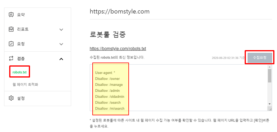 오른쪽에 [수집요청]을 누르시면 아래 노랑색 음영과 같이 robots 정보를 불러오게 됩니다.