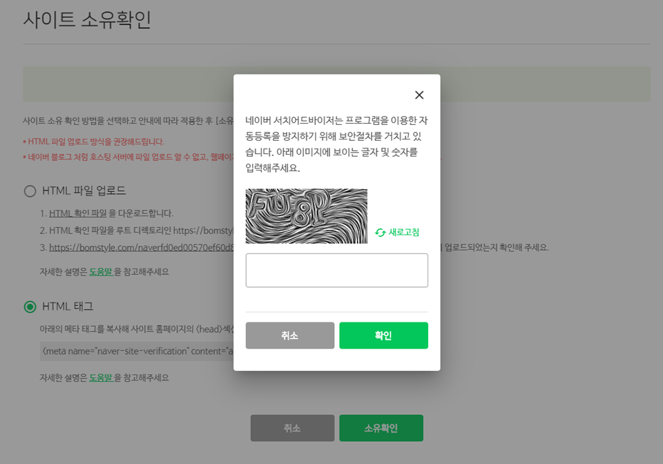 4. 사이트 소유 확인 화면으로 넘어 갑니다.
