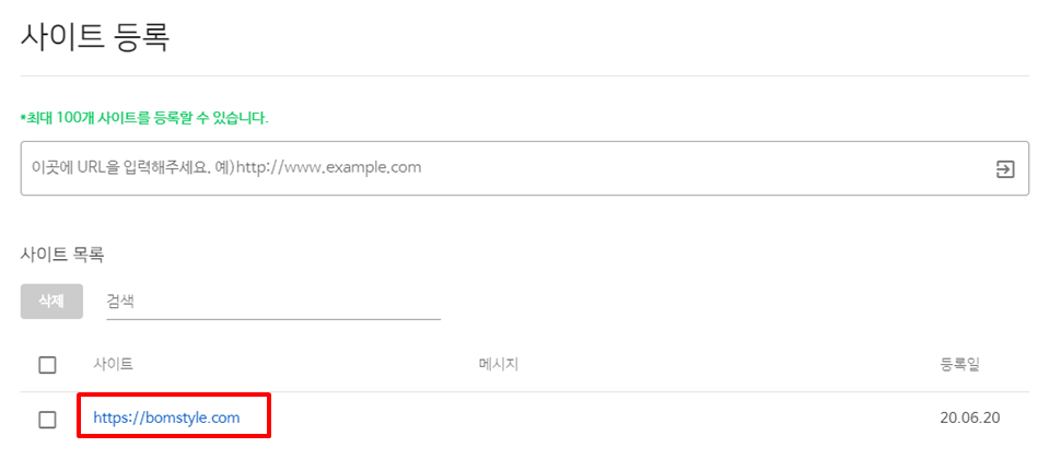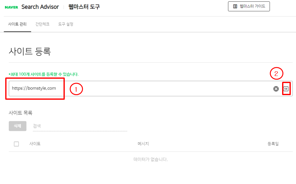 3. 사이트 관리 화면이 나옵니다. 여기서 티스토리 블로그 ① [도메인 주소를 입력]하면 됩니다.