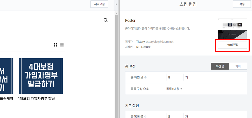 ② [적용] 버튼을 눌러서 HTML 편집을 저장 합니다.