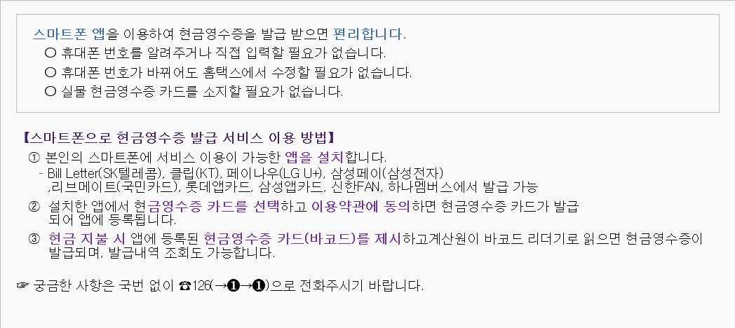 <스마트폰으로 현금영수증 발급 서비스 이용 방법>