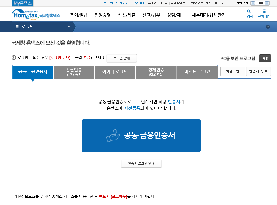 둘째, 공동˙금융인증서로 로그인을 합니다.