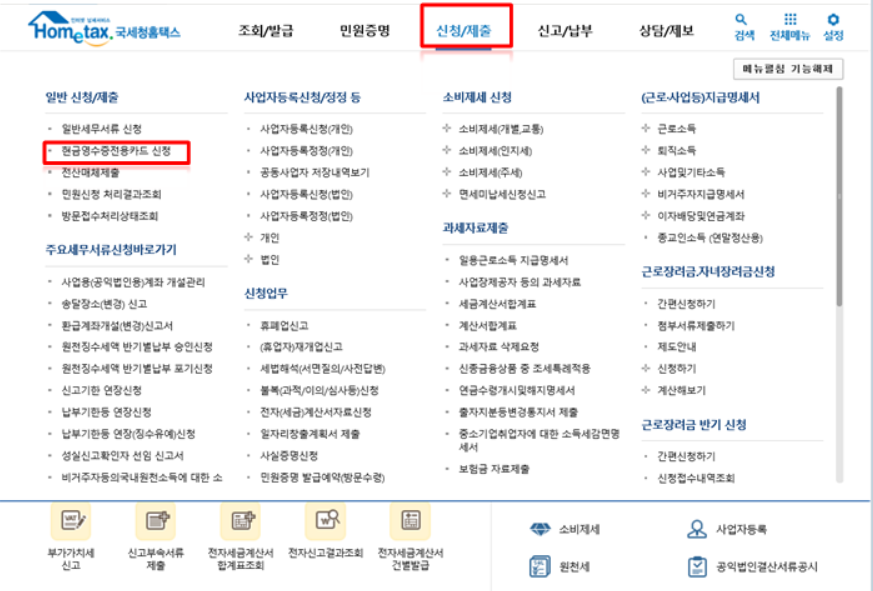셋째, 신청/제출에 보면 <현금영수증전용카드 신청>을 클릭합니다.