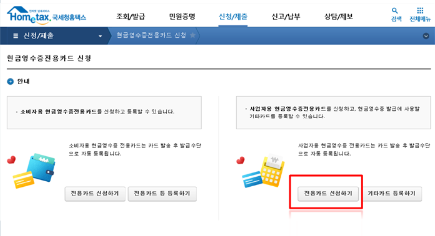 넷째, 오른쪽에 사업자용 현금영수증전용카드를 신청합니다.