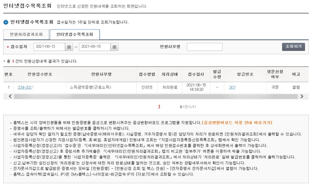 5. 인터넷접수목록조회에 보면 신청한 서류가 뜹니다.