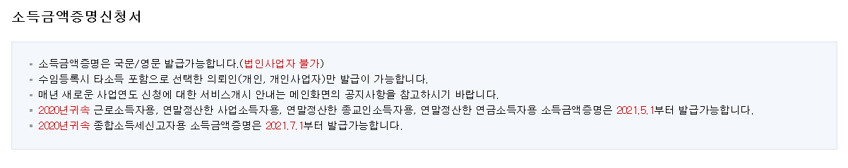 2020년 귀속 종합소득세신고자용 소득금액증명은 2021.7.1부터 가능합니다.