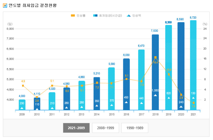 2009년부터 그래프로 보는 최저임금 현황이네요.