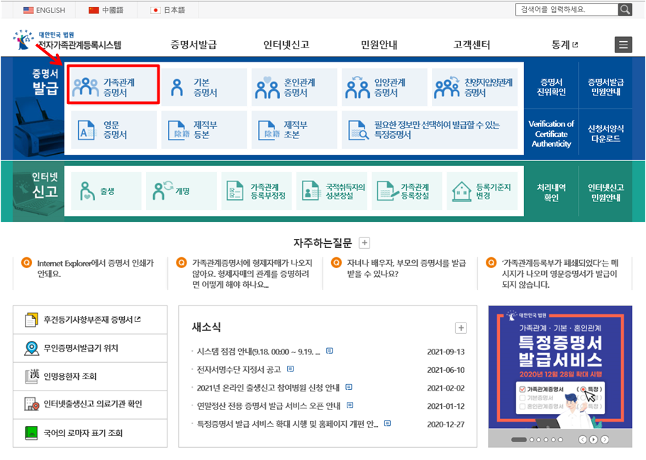 증명서발급에 가족관계등록부가 있습니다. 가족관계등록부에서 <가족관계증명서>를 클릭해주세요.
