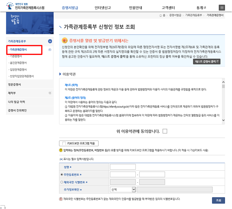 가족관계등록부 신청인 정보 조회를 합니다. 이용약관 및 개인 신상정보를 입력해주세요.