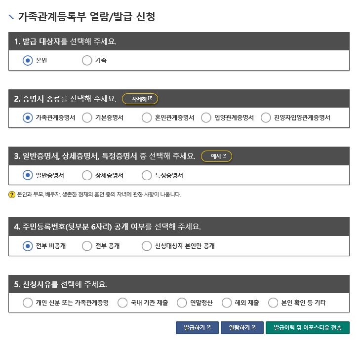 - 가족등록부 열람/발급 신청에서 발급 대상자를 선택해주세요.